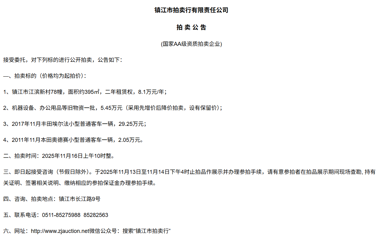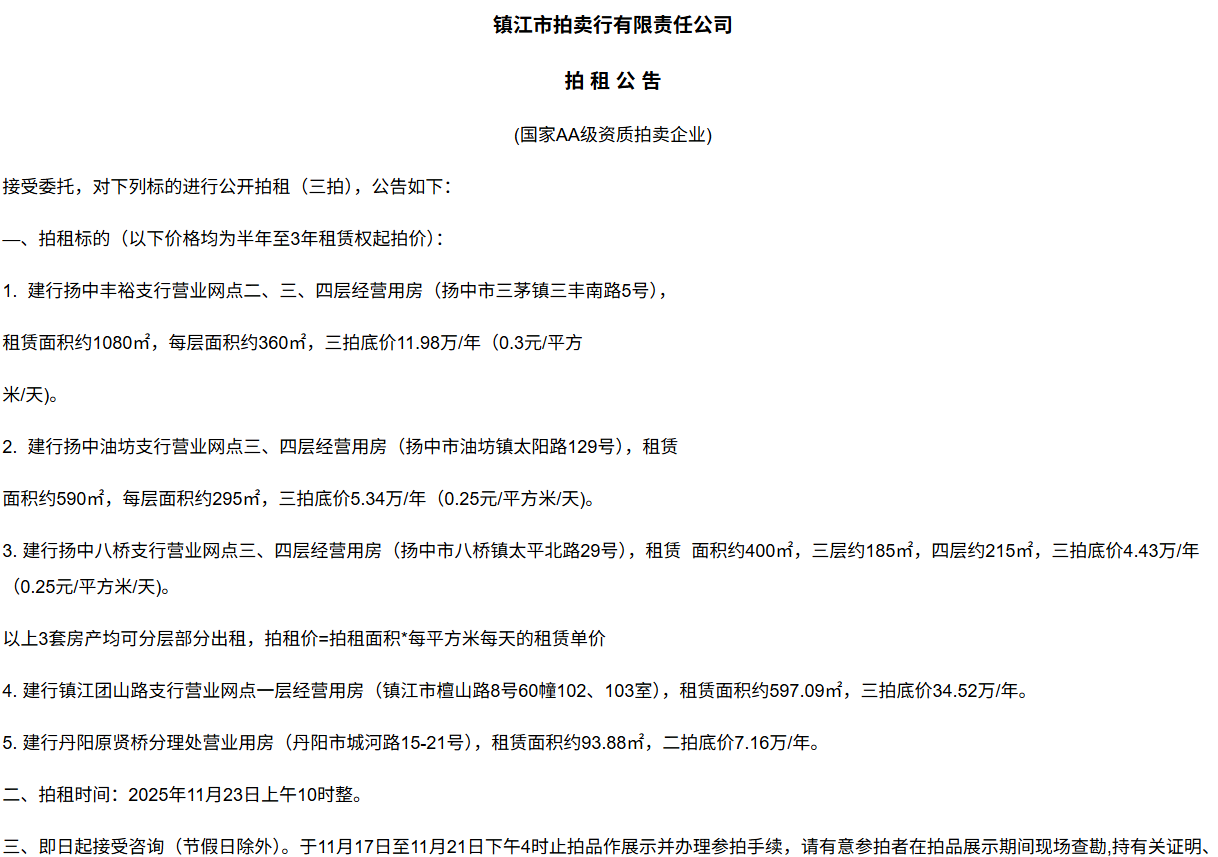 鎮江市拍賣行有限責任公司拍 租 公 吿(國家AA級資質拍賣企業)接受委托,對下列標的進行公開拍租(三拍),公告如下:—、拍租標的(以下價格均為半年至3年租賃權起拍價):1.  建行揚中豐裕支行營業網點二、三、四層經營用房(揚中市三茅鎮三豐南路5號),租賃面積約1080㎡,每層面積約360㎡,三拍底價11.98萬/年(0.3元/平方米/天)。2.  建行揚中油坊支行營業網點三、四層經營用房(揚中市油坊鎮太陽路129號),租賃面積約590㎡,每層面積約295㎡,三拍底價5.34萬/年(0.25元/平方米/天)。3. 建行揚中八橋支行營業網點三、四層經營用房(揚中市八橋鎮太平北路29號),租賃  面積約400㎡,三層約185㎡,四層約215㎡,三拍底價4.43萬/年(0.25元/平方米/天)。以上3套房產均可分層部分出租,拍租價=拍租面積*每平方米每天的租賃單價4. 建行鎮江團山路支行營業網點一層經營用房(鎮江市檀山路8號60幢102、103室),租賃面積約597.09㎡,三拍底價34.52萬/年。5. 建行丹陽原賢橋分理處營業用房(丹陽市城河路15-21號),租賃面積約93.88㎡,二拍底價7.16萬/年。二、拍租時間:2025年11月23日上午10時整。三、即日起接受咨詢(節假日除外)。于11月17日至11月21日下午4時止拍品作展示并辦理參拍手續,請有意參拍者在拍品展示期間現場查勘,持有關證明、簽署相關說明、繳納相應的參拍保證金辦理參拍手續。四、咨詢、拍租地點:鎮江市長江路9號五、聯系方式:0511-85275988   13655299933楊先生六、網址:http://www_zjauction_net.168fcw.cn;微信公眾號:搜索“鎮江市拍賣行” 拍品清單2025.11.23序號名稱起拍價(元)標的說明1建行揚中豐裕支行營業網點二、三、四層經營用房(揚中市三茅鎮三豐南路5號),租賃面積約1080㎡,每層面積約360㎡三拍底價11.98萬/年(0.3元/平方米/天)1、1-3號房產均可分層部分出租,拍租價=拍租面積*每平方米每天的租賃單價;2、意向競拍人在拍賣前需持營業執照或身份證與委托方說明租賃房產經營業態,確定意向后出具房產承租用途承諾書,經委托方審核后,方可交納保證金參加競拍;3、租賃期限為半年至3年(承租方與出租方協商而定),承租方每半年或一年結付租金,租賃期間的水、電費用及其它相關費用均由承租方承擔;4、承租方不得用于經營和保管危險物品,不得用于開設餐飲、娛樂等可能嚴重影響消防安全、運營安全的經營業態,不得用于經營委托貸款、小額貸款等可能冒用委托方名義,帶來聲譽風險的經營業態。租賃期內,承租方不得破壞墻體結構,自行成就消防、安全等使用條件,不得擅自將租賃房屋轉租、轉讓給他人使用,否則委托方有權收回房屋;5、拍租成交后,承租方將租金交至出租方指定賬戶,傭金交至拍賣方賬戶(拍租傭金為該房屋一個月租金)。承租方憑租賃合同無息退還保證金。2建行揚中油坊支行營業網點三、四層經營用房(揚中市油坊鎮太陽路129號),租賃面積約590㎡,每層面積約295㎡三拍底價5.34萬/年(0.25元/平方米/天)3建行揚中八橋支行營業網點三、四層經營用房(揚中市八橋鎮太平北路29號),租賃面積約490㎡,每層面積約245㎡三拍底價4.43萬/年(0.25元/平方米/天)4建行鎮江團山路支行營業網點一層經營用房(鎮江市檀山路8號60幢102、103室),建筑面積約597.09㎡三拍底價34.52萬/年5建行丹陽原賢橋分理處營業用房(丹陽市城河路15-21號),建筑面積約93.88㎡二拍底價7.16萬/年